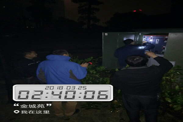 除了志愿者們,小區內另一個地方也在進行緊張的工作,那是金泉物業的工作人員和電力局的技術人員在搶修變電箱和電力線路。近日來的綿綿春雨和潮濕浸染,在昨晚突然造成了小區一部分電力線路的故障,雖已夜深,但工作人員仍堅守崗位,整夜工作在一線。為了能盡快修復電力線路,緩解小區業主的焦慮和解除他們的不便,金泉物業的工作人員耐心向業主們解釋說明,并抓緊組織搶修工作,馬不停蹄,任勞任怨。